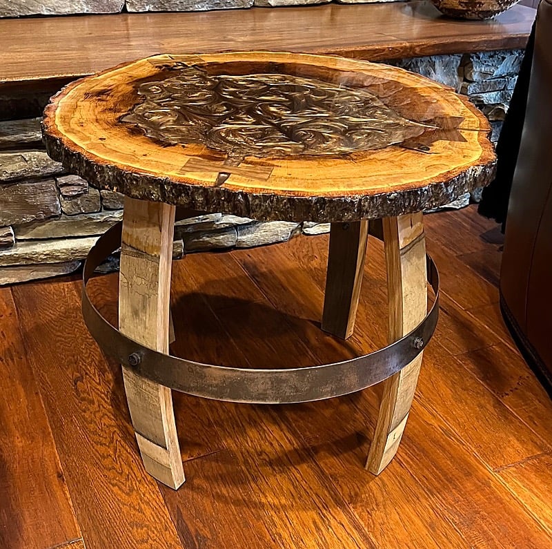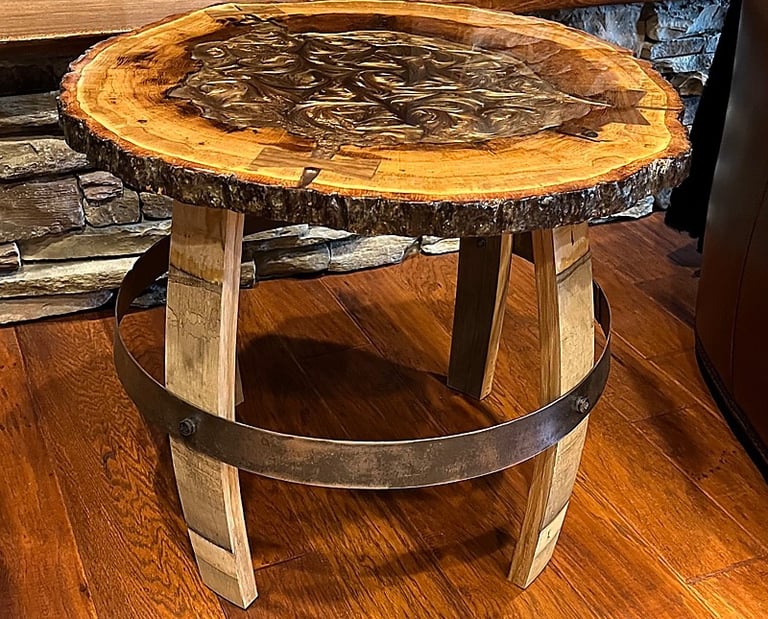 This one-of-a-kind table emerged over time. The process evolved from cutting the round from a dead tree, to air drying, to planing, sealing and eventually filling the center with resin. Then came more sanding, sealing, polishing, top coating with clear resin, and sealing the bark. What? You need a base too. Hmm, how about barrel staves for legs with a Jack Daniels barrel hoop? Charring the barrel staves added an authentic look and using gun bluing on the hardware tied it all together. Ta-da!